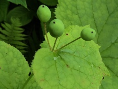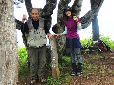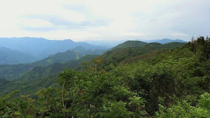![]() 北の方に見えるのは「高清水山」らしい。頂上ピークが二つある。右側が頂上らしい。 ![]() 南の方に見えるのが「高落場山」らしい。残雪が少し見える。今日はここまでのつもりだったが、高清水山の方へ少し探索に行く事にした。頂上より直接に高落場山の方へ下りる道があった。 この道もブナの林が素晴らしい。こちら側には太い木が多い。 ![]() ![]() 14.40分、「三方尾根」の標識が建つピークについた。「道宗道」の標識も建っている。左右の道が道宗道である。右へ行けば高落場山、左へ行けば高清水山である。 ![]() 草沼山から三方尾根へ出て、高清水山の方へ降ったら、14.15分に林道に出た。朝歩いた林道の続きである。尾根の上を走っているので、この林道が道宗道である。林道はほとんど水平なのでずんずんと歩ける。 ![]() 14.55分に林道の横の広場に、石を積み上げたモニュメントがあった。「どうしゅう さまの かよいみち」と石三つに彫ってある。 ![]() ここで林道から分岐した左の作業道を歩く。500mほど歩くと、登山路が下から作業道を横切って斜面を登っている。高清水山登山口の標識がある。道宗道もここを登って行く。15.07分。 ![]() 「ヤマサクラ」が今頃咲いている。 ![]() 「タムシバ」もまだ残っている。 ![]() 「ユキツバキ」 ![]() 「チゴユリ」 ![]() 15.27分に西側のピークに着いた。道宗道の標識があり「オエズコの頭」と書き込んである。向うに見えるのが頂上らしい。ここまで来たら帰る訳にはゆかない。 ![]() 砺波平野が見える。一度、鞍部に降る。残雪がある。雪の上に足跡がある。テープを頼りに慎重に歩く。 ![]() 15.35分に高清水山の頂上到着。道宗道の標識がある。「城端(瑞泉寺)の方へ12.8km・五箇山(行徳寺)の方へ16.0km」と書いてある。 ![]() 木の上の方に、白丁シャツに山名を印刷した「山名シャツ」が掛かっている。日付も入っている。一週間ほど前だ。草沼山にも掛かっていた。富山散策なっくんと書いてある。黒い犬の名前らしい。犬と登っているようだ。 ![]() 以前に魚津の濁谷山でもこのシャツを見た事がある。少し降りると高落場山と手前の草沼山がみえる。 ![]() 雪のある山が見える。白山?。 ![]() 16.13分に林道に降り立つ。ここで一思案。林道を歩いて戻る積りだったが、地図を見ると林道を横断する道は、直接縄ヶ池に続いている。しかも距離が短い。地図を見る限りでは距離は林道を歩くより3分の1か4分の1くらいしかない。それだけ急な坂道と云う事になるのだが、覗いてみると手入れはしてあるようだ。 下りなら何とかなるだろうと、直接縄ヶ池へ降りだす。降り口の細い杉の木に「富山名木十選千年杉」と云う白い札が提げてあった。この杉千年杉?。何のことか判らなかったが少し降りたら判った。この道は「千年杉」に至る道だったのだ。 本物の千年杉が、次から次へと。 ![]() この杉には「縄文杉」と書いてある。誰かが書き足したようだ。 ![]() 段々、尾根が細く、急になってくる。ロープが下がっており、掴まって慎重に慎重に。 ![]() 縄ヶ池の全体が見下ろせる。向こうに砺波平野も覗いている。 ![]() まだまだロープの下った急坂が続く。 ![]() ![]() 16.50分に池のふちに降り立つ。登る前に歩いた遊歩道の近くだった。 遊歩道の概略図を見ていたら、降りて来た道が載っていた。「至 龍の背中・千年杉群」と書いてある。私は龍の背中を降りて来たらしい。 駐車場と歩いた林道も載っている。「至 高落場山」と書いてあるが、私は高清水山へ登った。 ![]() **次回登山は、5/29富山県の「八乙女山」へ** 2011年06月13日・縄ヶ池林道下調べ 仲間が「人形山」の山開きに行ってきた。私は都合悪くて参加できなかったが、話を聞いて参考にしょうとネット調べていたら、その近くの「縄ヶ池」に通じる林道が5月末に、三年ぶりに開通して通れるようになったと出ていた。その林道の途中から「高落場山」に登る道がある事を見付け、二日前に登り口の確認に出掛けた。(6月13日) ![]() 金沢に夕方用があったのだが、2時間ほど早く家を出て、東海北陸高速道路を福光インターで降り、国道304号線を五箇山の方へ進む。城端の町を抜け段々高度を上げて上って行くと、国道よりいきなり左に細い道が分岐している。縄ヶ池の標識がある。舗装してあるが細いクネクネとした道を慎重に上がって行く。やがて突き当りの、大きな広場に着く。南砺の町が見下ろせる。 ![]() 広場に車を置いて鎖のしてある林道を下がって行くと、左に池が見えてくる。水芭蕉はとっくに終わり大きな葉だけが茂っている。ぎっしりと葉で埋めつくされている。花の頃は綺麗だろう。 ![]() 遊歩道を抜けて池のほとりまで行ってみた。静かな池である。 2011年06月15日(水)初登山 縄ヶ池林道-唐木峠-「高落場山」往復 ![]() 3年ぶりにやっと開通した林道だ。梅雨に入って大雨が降るとまた通行止めになりかねない。梅雨に入る前に「高落場山」に登ってしまおうと、さっそく相棒とN女史を誘ってやってきた。