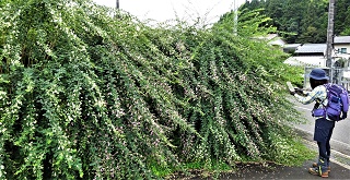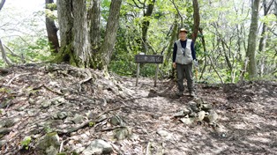 2024年06月09日(日)7回 馬出ルート-「一乗城山」-英林塚ルート 仲間の中川氏が今年2月に、谷川岳で滑落死された。大坂のN女史は大分ショックだったらしいが、仲間の顔を見たいから一度歩こうと言う事になった。別に呼びかけたわけでは無いが、中川氏の仲間が6人で「一乗城山」登る山行となった。大坂から一台、金沢から一台、小松から一台、福井インター降車で最初のコンビニに集合。三台揃って一乗谷朝倉遺跡の復元町の第一駐車場に車を置く。今日はここから「馬出ルート」で理彫り「英林塚ルートで降りる予定。 出発前に何方かが、中川家よりの形見を預かってきたとの事で分配。私は熊鈴と腰ポーチを頂いた。熊鈴をストックに付けて出発。9.20分。 駐車場から「朝倉館跡の門」が見える。向こうは「一乗城山」である。 朝倉館跡の門。 アザミ 馬出ルートの登り口へ。 黄色い花は ブタナ かな。 八幡神社の横から林道に入る。 杉林を過ぎると左に登山口の入口がある。 何の遺跡。石像一体。周りの草が刈ってある。最近刈ったらしい。 滑りそうな橋。 石垣では無く砂防ダム堰堤。風景にマッチさせてある。右に登山路。 「小見放城」がここにあったらしい。 大きな岩。手前の岩に摩崖仏が彫ってあるらしい。判別出来ない。 新緑。 ここにも何かの石版あり。 中々の急坂。とっくに女性陣に置き去りだ。 分岐。帰りはここから「英林塚コース」を降りる予定。 「不動清水」を通過。清水が湧いている。誰かが清水を掃除している。有難う御座います。 「千畳敷跡」広場到着。電動ノコを持った数人が草刈り中。草刈は今日だった。不動清水の人もお仲間らしい。有難う御座います。 皆は展望台の方へ行ってきたらしい。待っていた。 コアジサイ が満開だ。 ガクアジサイ ササユリ ソヨゴ 「一の丸跡」を通過。 イチヤクソウ ササユリ 「二の丸跡」通過。次の三の丸跡が「一乗城山」頂上である。 三の丸跡の前に大きな堀切がある。 堀切を登り切ると広場、その先が「一乗城山」の頂上。展望無し。12.00時。 広場に降りて昼食。さすが女性の昼食、リュックからいろいろの物が出てきて豪勢。 単独登山者が登って来たので集合写真のシャッターを頼む。5人の張り切り女性とヨタヨタの迷惑老人が一人。すみません。 堀切を降りて下山開始。 不動清水まで降りてきた。不動さんの石像があるので不動清水。 分岐より「英林塚コース」降りる。このコースは初めてである。 谷道である。時々「通行注意」の標識がある。中々の道、老人は緊張して通過。 ヒヨドリバナ トリアシショウマ ウリノキ 川を渡る。 ここも「通行注意」 登山口に降り立った。この先道が三方に分岐。完全置いて行かれ状態。何処から降りるかな。 「南陽寺跡庭園」に寄ってみた。山裾の石組が庭園らしい。 だいぶ遠回りして「朝倉館跡の門」に出た。 門より中を覗く。だいぶ遅れたのですぐ駐車場へ。 駐車場に着いたが誰も居ない。自販機とトイレが目的で「復元町並」を往復。久しぶりに入った。 老人は百円だった。駐車場に戻ったら皆が老人を探していた。すまんすまん。 駐車場で解散。 帰ってからパンフレットを見ていたら、登山コースも載っていた。登山口に旗が立っている。「下城戸ルート・馬出ルート。英林塚ルート」と、山の反対側から「三方岩ルート」がある。まだ歩いていないスポットも多数。またの機会にだな。 ■次回登山は、6/12「揚原山」へ■ 2024年03月16日(土)6回 道の駅-「御茸山」-「マキ山(城山)」一周 福井インターで下車。一乗朝倉氏遺跡に向かう。途中の「道の駅一乗谷あさくら道の駅」に車を置かせてもらう。すぐ横に水車。10時。 道路に並行して電車線路がある。一乗谷の方へ歩き踏切を渡る。いきなり最終目的地の「槇山(東郷)城跡4.4km」の標識。結構遠いな。 六地蔵のの横から「福井里山トレイル」に入る。 階段。大きなファスナー「開け閉めして柵を通る。 「展望広場」があるらしい。 初めての山なので様子が判らない。 31号墳(円墳)の前が展望広場だった。10.30分。 「御茸山古墳群」の標識。みたけやまと読む。120基の古墳の山だった。 展望広場より足羽川が見える。 戻って尾根の道を行く。「41号前方後円墳」辺りに御茸山の頂上ランドマークがある。何処が頂上か判らないが、ヤマップでは登頂と認定される。 鉄塔の横に出た。一乗谷朝倉遺跡の方が見える。日当たりが良くてスミレが咲いていた。 分岐に出た。 分岐は300m先で合流と書いてある。先行のS女史はどちらへ?。坂を越えるか横に巻くか。老人は楽そうな横巻き道へ。 合流点に到着。同じ高さに登るからどちらでも同じ。横巻き道は少し遠回りになる。彼女は直登を選んだ。 少しなだらかになる。 まだまだ古墳が続いている。 分岐に出た。展望は無いがベンチがある。地図を見ると「245ピーク」である。この遊歩道の最高地点である。ここで昼食。11.50分。分岐を降りると「下城戸跡」へ出る様だ。 出発。いろんな標識あ