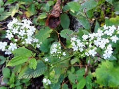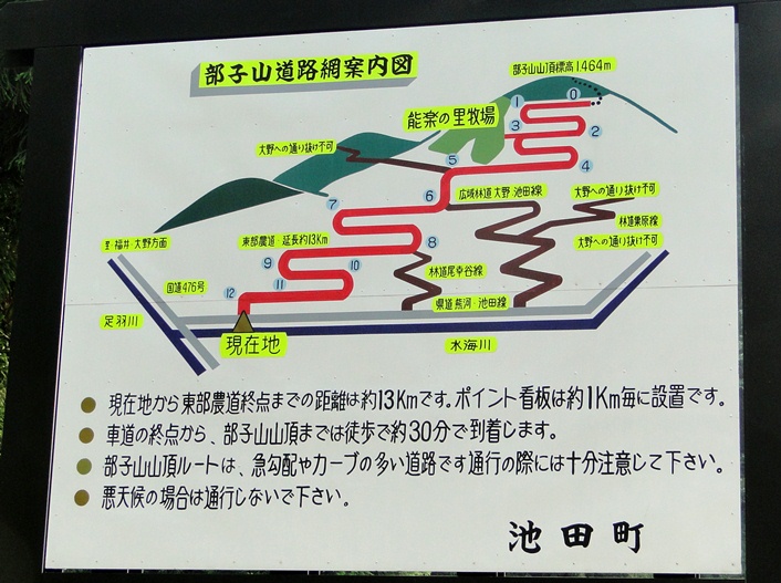 三角点の側で昼食休憩。一時間のんびりしていたら、全員下山していって我々だけになった。登って来た道を降りる人が大部分である。 我々も12.45に下山開始。部子山の方へ降りてゆく。 ![]() ![]() 少し降りた地点に「極楽平・根曲り疎林帯・周回トレッキングコース」の分岐がある。少し寄り道してみる。 ![]() 途中に「希望の鐘」なるものが下がっていた。鳴らしてみる。 ![]() ![]() ![]() ユキザサ ![]() 急坂で転ぶのが嫌で、ロープに繋がりながら、用心して降りていたら、3時間以上も掛かり、16.10分に鳥居が見えてきた。 ![]() 一番最後で、駐車場には我々の車だけ残る。 自分としては、久し振りに標高差の大きい山に登って来た。標高差700mを登った。何とか登れたぞ――。 ![]() 銀杏峰「YAMAP」による記録 ■活動日 2018/09/19(水) 07.45-16.13 ■活動時間 7時間50分 Ⓢスタート7.45→(7分)→登山口7.52-7.58(6分)→3時間43分→ 銀杏峰11.41-12.51(1時間10分)→3時間22分→Ⓖゴール16.13 ■活動距離 4.3km ■高低差 701m ■累積標高上り/下り 715m/723m ■次回登山は、9/23岐阜県の「福地山」へ■ 2011年10月10日(祝)初登山 能楽の里牧場より-部子山往復 仲間のS女史が「銀杏峰」に登ってきたと云う。登りごたえがあったらしい。どんな山かと調べていたら隣に「部子山」を見付けた。これならば私でも登れそうだ。変わった名前の山だ。本に寄れば、福井県出身の継体天皇の妃「目子媛」を祀った山で、目子ノ岳が部子岳となまり、いつの間にか「部子山」になったという。山頂近くに牧場が出来たみたいで、林道が出来、それを利用すれば20分くらいで登山できると書いてある。いくらなんでも、それでは登山と云えないので、本「福井県の山」の通り、牧場の下の方のゲートから、牧場内の道路を登る予定である。 加賀ゆめのゆに、7.30分待ち合わせ。車一台で高速に乗る。今日はN氏とS女史の三人。福井インターで降り、一直線国道158号を走り、途中「小和清水奈良瀬トンネル」を抜けた所で、「上新橋」を渡らずに直進して「池田町」に向かう。池田町より「水海」地区に向かう。水海には、田楽能舞の伝わっている「鵜甘神社」がある。能楽師の端くれとして、能楽の古里として訪ねた事があるので、地理は少し判る。その道をそのまま進むと左に大きな林道の分岐があった。舗装のしてある立派な道である。下の看板があった。13キロとは長い林道だ。 ![]() 始めは広くて舗装がしてあるが、段々と細くなってくる。すれ違いが困難になってくる。上から車が降りてこない事を祈るのみ。やがて時々舗装が切れる。車の底をこする。5番ポイントの分岐に初めて表示板。右の道を登る。 ![]() 牧場の下の方のゲートに車を置く予定だったが、ゲートがUターンをするように後ろ向きに付いており、舗装道路になっていて、調子が出ていて、道も狭いし、半分気付かず通り過ぎたようだ。3番ポイントのヘアピンカーブの上に広場があったので車を止める。9.35分。 ![]() そこは牧場の最上部だった。牧場に入る道にはゲートが閉まっている。能楽の里牧場の御影石の標識が見える。その後ろの小山に階段が見える。あそこが展望台で、地図に1321mの記入してある地点だろう。 ![]() 林道を歩き出す。ブナの林が少し紅葉している。9.50分、第2ポイント通過。 林道を回り込んだら、初めて前方に部子山の頂上らしきものが見えてきた。霧がかかっている一番奥の微かなピークが、山頂らしい。林道の脇に車が4.5台留まっている。登山ではないらしい。ラジコンの飛行機愛好者らしい。1m以上もある大きな飛行機だ。横の尾根まで登ると、四方が開けているので、そこから飛ばしている。 ![]() ![]() その脇を通り抜けたら、10.00分。第1ポイントに出た。第1ポイントからは旧道登山路が尾根を登っているので入り込む。気持ちの良い道である。 ![]() 周りに背の低いブナがあり、実が付いている。最近やっとブナの実だと分かるようになった。 ![]() 10.05分、鳥居のある部子山神社跡に出る。建物があるが雪囲いの戸締りがしてあり、中は覗けない。神社でも無さそうだ。 ![]() 先へ進み、少し降ると林道の最終地点に出た。第0ポイントである。少し戻った所にあずま屋が見える。無理をすればここまで車は入れるのだ。ここから登山路になるが、頂上まで10分の立札がある。林道入り口の看板には30分になっていた。 ![]() しばらく登ると、木が低くなり、周りは開けて草原の尾根歩き。イチゴの花が残っている。 ![]() この花は判らない。 ![]() 10.25分、部子山山頂に到着。欠けた三角点が在る。
