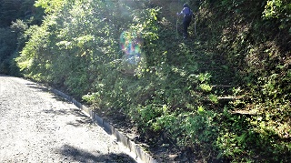 ![]() 「目子媛」を祀ったと思われる祠がど真ん中にある。この案内板は加賀の低山徘徊部の物である。なんとなく雲か霞で、遠くの山は見えない。N氏に紅茶入れて貰う。美味しい。 ![]() すぐ隣が銀杏峰である。どっしりとした大きい山だ。お天気が良ければ、白山、御嶽、乗鞍から福井市から日本海まで見えるらしい。目の下の大野市が微かに望める。 ![]() 「ツリガネニンジン」だと思うが、色が白い。 ![]() 記念撮影をして、11.05分下山開始。とうとう誰も登ってこなかった。 反射板の左に鳥居と神社跡、下がった所があずま屋、その向こうの林道に車が何台も置いてあり、尾根に登って飛行機を飛ばしている。 ![]() ![]() 第0ポイントまで戻ったら、車が1台登って来ていた。頑丈な車ならここまで登ってこれるのだ。私の乗用車では無理だろう。神社跡には登らず林道を歩く。林道にあるのはあずま屋ではなくて、真新しい避難小屋だった。林道に車を置いて、尾根で飛行機を上げているのを覗きに行った。大きな飛行機をラジコンで飛ばしていた。この尾根の最上部に反射板がある。尾根の上は歩きやすいので、直接車の置いた地点を目指す。 ![]() あと少しの所で藪が深くなり、藪を漕ぐ。笹の林の中を行く。笹より帽子だけが辛うじて見える。 ![]() 11.50分、車を置いた広場に降りる。もう牧場に牛は居ないかと思ったのに、五頭ほど草を食べている。 ![]() 牧場入り込み登る予定だったルートを確認。牧場の反対側のふちに、牧場の道がここまで続いている。池田の町が見える。広場で食事をして、コーヒーも入れて貰って、長い林道をソロソロと降りる。林道の入口に着いたのは、13.30分だった ![]() 帰りに久しぶりに、田楽能舞の行われる「鵜甘神社」に立ち寄る。ついでに池田の中心部にある「須波阿須疑神社」にも参り、隣の「能楽の里歴史館」に入り、ビデオで、水海の田楽能舞の様子を見る。私と同じ囃子方の太鼓が映っており、中々の活躍で興味深くて面白い。 |
