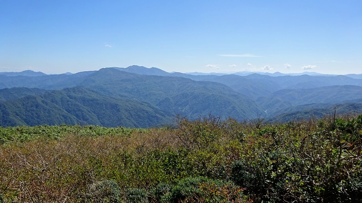 2018年09月19日(水)初登山 宝慶寺いこいの森小葉谷より銀杏峰往復 「銀杏峰」は初めてである。S女史が登った時感想を聞いたら、登りごたえがあるよ、とかで今まで敬遠していた。この度、福井県の登り残した山を登ろうと、ハッパを掛けられて銀杏峰に登ることにした。銀杏峰は地理院地図に「げなんぽ」と仮名が振ってある。ギンナンホウがなまったものだろう。隣の山の「部子山・へこさん」は登っているので、場所は知っていた。大野市の「宝慶寺いこいの森」から入り込むらしい。 6.00時に加賀ゆめのゆでS女史を乗せ。加賀ICから乗り福井北ICで降りる。そのまま中部縦貫自動車道の無料区間が大野ICまで続いていた。便利になったものである。県道34号線を走ると「宝慶寺いこいの森」に着いた。ここから「名松コース」が始まっている。このコースは距離が長いので、今回は「小葉谷コース」を登る予定で、いこいの森の林道をそのまま登って行く。4kmほど上る。ほとんど舗装されている。やがて左側に大きな駐車場が現れた。我々一台だけだったが、77才の男性が現れて二台になった。07.45分。![]() 登山用意していたら、山の稜線に光が差してきた。あそこが頂上ですか?と男性に聞いたら、あの稜線を左に進むのだそうで、ここから見えないらしい。地図を見ると、この地点から稜線まで、標高差650mを一気に直線に登るコースになっている。標高線が細かく詰まり、急坂が続いている。まさに先が思いやられる。今まで登るのを諦めていた理由だ。名松コースは、登り坂は少し緩やかだが、距離は2倍ほどあるし標高差も300m以上も多くなる。車二台で一周する人が多いようだ。 ![]() 7.55分。駐車場前の鳥居をくぐって登山路に入る。地図を見ると登山口の標高は750m位だ。車は無いので下から歩いて来たのかな、二人組が先に出発。一人の77才男性は元気ですぐ追い越して行った。我々二人はのんびりと歩きだす。 ![]() いきなりの急登。 ![]() 8.17分、林道に合流。この林道は車で登って来た林道の続きだが、めちゃくちゃ遠回りしているので、歩くには不向き。30mほど左に歩くと続きの登山路がある。 ![]() 林道から5分ほどで、鉱山跡分岐の標識がある。「海抜約・850m」と書いてある。右へ行くと昔の鉱山の石垣があるらしい。左へ登って行く。ロープの下がった坂が続く。 いろんな花が咲いている。 ![]() ![]() ![]() オトコエシ キンミズヒキ ツクバネソウ ![]() ![]() ![]() クルマバハグマ ホツツジ ![]() ![]() ![]() ヤマボウシ ![]() ブナの木が段々と増えてくる。9.25分に「ブナの木」の標識に着いた。ブナの木のある展望台だ。「海抜約・1100m」と書いてある。 大野市が俯瞰できる。 向こうの山並みの一番低い所は、数日前の新聞に載っていた「石川県小松市から福井県勝山市までの国道416号線が繋がって完成祝いがあった。」との記事。国道416号が通っている場所である。左が「越前甲」と「大日山」と「加賀甲」だろう。越前甲に登るのに便利になったようだ。 ![]() ![]() ![]() ![]() アキノキリンソウ クルマバハグマ ![]() ![]() ![]() モミジバハグマ ダイモンジソウソウ 9.50分にまた下界が望める地点があった。右に「白山」が見えてきた。 ![]() ![]() 10.00時に標識。「此より急登要注意 海抜約・ 1.200m」と書いてある。「銀杏峰の貴重な植物を守りましょう・銀杏峰を愛する会」と書いてある。 ここまで急坂をよじ登ってきたのに、今更「此 より急登要注意」の看板にガックリ。 ![]() ![]() ![]() 何? カニコウモリ サラシナショウマ ![]() ![]() ![]() トモエシオガマ トモエシオガマ ![]() ![]() ![]() ノジギク? シライトソウ アキギリ ![]() ![]() ![]() トリカブト アキギリ ダイモンジソウソウ ![]() ![]() カメバヒキオコシ ユキザサ ![]() 11.15分「此より急下り要注意 海抜約・1.300m」の標識に出る。 どうやら急坂も先が見えてきたようだ。 隣の「部子山」が見えてきた。銀杏峰とほとんど同じ標高だ。二つの山の間に登山路無し。 ![]() ![]() 11.20分。標識「此より極楽平-頂上 海抜約・1.380m」と書いてある。 朝、一緒に登った77歳の男性が早くも降りてきた。もう坂はありませんと慰めてくれた。 頂上一帯は広い台地だった。向こうに見える、ぴょこんと突き出たのが頂上らしい。 ![]() 左手に「白山連峰」が見える。雲が湧きつつある。別山から三の峰まで見える。 ![]() 道の真ん中に「リンドウ」群落があった。 ![]() ![]() ![]() ![]() 11.45分に、銀杏峰の頂上に到着。三角点がある。 ![]() 途中で追い抜いて行った15人ほどが、全員食事中 ![]() 小さな祠がある。石仏二体。 「白山」 ![]() 白山の右側の方に「荒島岳」。 ![]() 南の方は岐阜県境の山々。能郷白山や冠山や金草岳辺りと思われるが判別出来ず。 ![]() ![]()