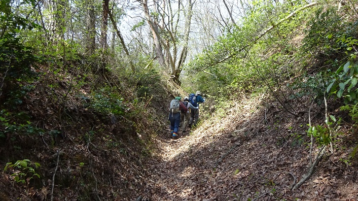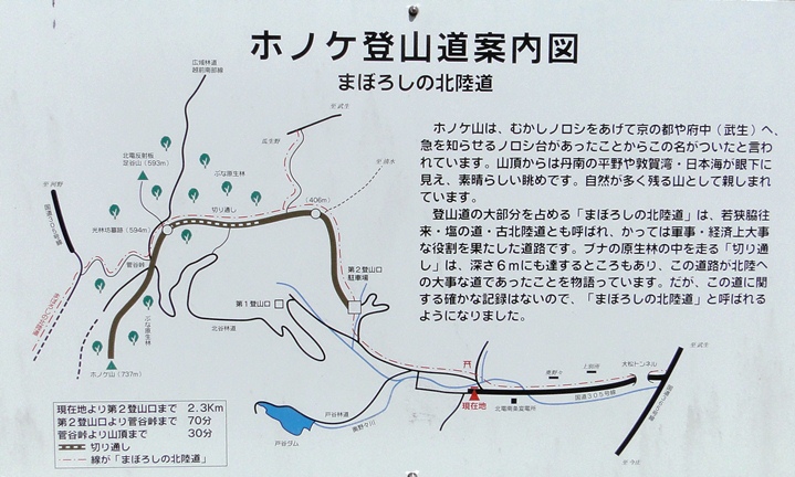 2016年04月09日(土)4回 10日ほど前に、どうゆう訳か珍しく相棒K君が電話をかけてきた。相棒の最近の山友メンバーが、私と一緒にどこか山へ登りたいと言ったらしい。山友が時々私のこのHPを見るかららしい。何処でも良いと云うので、「ホノケ山」は如何と云った。 ![]() 8.00時に加賀ゆめのゆで待ち合わせ。相棒とI女史とI氏の3人。もう一人の山友は、只今エヴェレストトレッキング中という。凄いね。3人を乗せて南条SAで休憩。そのままETC出口より出て、国道を南へちょっと走ると、ホノケ山登山口の看板があり右折してホノケ山トンネルの方へ進む。トンネルの少し手前に右に入る林道がある。第2登山口の標識あり。突き当りの駐車場は5台でほとんど満車状態。 ![]() 9.20分頃出発。相棒とホノケ山を登るのは初めてであるし、あとのお二人さんもこの山は初めてで良かった。小さな尾根を登りきり、少し進むと、裏側の瓜生野町から登ってくる登山道と合流。暖かいのでここで抹茶休憩。相棒にお茶を点てて頂くのは久しぶりである。いつもありがとうございます。 ここからは「切り通し」の登山路が続く。「まぼろしの北陸道」と呼ばれている部分で、昔は人馬ともに通ったらしく、道が掘り下げられている。天候の悪い風雪の時にも役立った様だ。 ![]() ![]() ![]() ![]() 途中に左より、トンネル横から登ってきている林道のヘアピンカーブの先より、登ってきている巡視路がある。誰も通らないようで荒れているが、登山路案内図看板に載っている。この分岐に「足谷反射板」の標識がある。地理院地図に「足谷山」の記入がある。山の上に反射板があるようだ。 ![]() 一度登りたいと思っていたので、これを機会に登りたいと提案。ピークハンターの相棒よ。登攀山名が一つ増えるぞよー。「佐々布光林坊墓跡」のピークより菅谷峠へは降りずに、足谷反射板の矢印の方へ降りてゆく。11.05分。 ![]() 一度、菅谷峠へ登る林道に出る。道を横切って向かい側に、足谷山へ登る巡視路が登って居る。荷物を置いて登り出す。振り返ると降りてきた巡視路が見える。 ![]() 11.20分に反射板に到着。登って来た日野山の方が見えて展望が良い。反射板の周りはよく手入れされて広い。しかしそれ以外は藪の中である。 ![]() ![]() 反射板から降りて、リュックを拾い、林道を菅谷峠に登り返す。峠に新しいあずまやが出来ていた。その隣に電波中継所みたいなものも建っていた。11.40分。 峠を横切り、ホノケ山の方へ登り出す。振り返ると「足谷山」が見える。手前の「佐々布光林坊墓跡」のピークより、向こうの反射板まで登り、林道をここまで登ってきた。 ![]() ここからは素晴らしいブナ林が続く。 ![]() 頂上の手前に展望地が出来た。ベンチがあり眺めが良い。 ![]() ![]() 12.30分に頂上到着。やっくり遠回りして登って来たので、誰も居なかった。昔の山名札がまだ残っていたので、三角点で撮影。昼食。美味しい果物ありがとうございます。向こうに海側が広がっているが、黄砂とかで海がハッキリ見えない。 単独登山者一人到着。 ![]() 山名版を見ていると「白山」が書き込んであるが、今まで見えたことが無い。 ![]() ![]() 今日のパーティの4人の記念撮影をする。I女史は写真嫌いで有名らしい。珍しく並んだと思ったら、やはり下を向いていた。 13.20分頃に下山開始。ブナ林を降りてゆく。すぐ下の展望台で、眺望とお別れ。 ![]() ![]() ![]() ![]() ![]() 今日見かけた花 椿 三つ葉躑躅 辛夷 ![]() ![]() ![]() 岩団扇 碇草 黒文字 ![]() 14.55分に駐車場に到着。我々の車だけ残っている。皆さまお待ちかね。遅れましてすみません。 ホノケ山トンネルを抜けて国道8号線に出て、通り道の「しきぶ温泉湯楽里温泉」に入って帰る。 ★次項2016年の第30回登山は、4/10福井県「野坂岳」へ★ 2014年11月30日(日)3回 明日からこの冬一番の、寒波が襲来と騒いでいるが、今日だけは暖たかくて、久しぶりに雨の心配はないようだ。S女史から、大阪からN女史も来るから、何処か一緒に登ろうと云う事になって、「ホノケ山」になった。それにH女史とМ女史の、4人の参加決定。 7.30分に加賀ゆめのゆで、熟女4人を乗せて出発。南条SAのコンビニで昼食を買おうとしたら、今日は久しぶりに「鍋パーティ」をするから、何も買わないようにと云われる。御握りもいっぱいあるから差し上げると云う。ETC出口より出て、今庄の方へ少し進み、ホノケ山トンネルへの方へ右折する。トンネル手前右に、ホノケ山第2登山口への林道がある。舗装してある細い林道を進むと、突き当りに駐車場がある。5台ほど留まっていて満杯状況。9.00着。9.10分出発。少し登ると右手にホノケ山が見える。その尾根続きにホノケ山の南峰が見える。10mほど高い。最近はあそこまで登る人が居るようだ。 ![]() 尾根上に登り着くと、登山路は平になる。日差しが気持ち良い。 ![]() 今日の楽しい仲間たち。 ![]() 「切通し」のブナ林を行く。 ![]() 10.45分。一度林道を横断。見晴らしが良い。日野山と、6月に