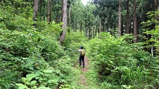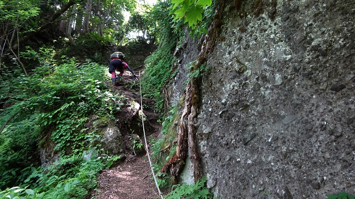 2019年06月19日(水)4回 桂原新道で「祖父岳」往復 S女史がまだ登って居ない「祖父岳」へ登る事になった。近くの「夫婦山」は二人で登った事がある。祖父岳は以前、谷折町の方から登った事がある。登り口の民家のお爺さんに、挨拶を欠かして叱られた思い出がある。それ以来ちょっと登るのを遠慮していたが、その時には開通していていなかった反対側からの、榊原口登山道が出来たようだ。距離は長いがその分傾斜は緩そうだ。 8.15分頃に小松を出発、高速を富山西ICで降り八尾に向かって走る。国道472号線で八尾を抜け、三差路分岐で左に県道323号で野積方面へ進む。国道をそのまま進めば「白木峰」の方だ。一本道で西松瀬の集落で、大きな登山案内の看板があった。右に林道祖父岳線が始まり、祖父岳登山口まで4K。手前の橋を渡ると夫婦山松瀬登山口がある様だ。こちら側から、夫婦山には登ったことが無い。 ![]() ![]() 林道は少し狭いが、舗装してあって走りやすい。祖父岳の山裾を回り込むが、凄い岩壁となってる ![]() 岩壁を過ぎてから、しばらくで右に入る分岐がある。この新道は国土地理院地図に載っている。 ![]() 100mほど入ると突き当りに駐車場がある。向きを変えて車を置く。9.55分。 ![]() 林道と駐車場の間に登山口がある。 ![]() 杉林の中を大きくジグザグに登って行く。 ![]() ![]() ![]() 何の実? ニガナ このイチゴは甘くてうまい ニガナ ![]() ![]() ![]() ヒヨドリソウ 葉が何? ヘビイチゴ ![]() ![]() ![]() 何?色々ある ガクアジサイ トリアシショウマ ![]() ![]() ![]() 杉林を抜け、尾根に登り着いたら、ピンク色のササユリが何本も咲いていた。 ![]() 尾根を歩き出したら、高低差は無いが、尾根が細くなり、岩ごつごつの道になってきた。左の下に畑みたいなものが見える。前回登った登山口辺りと思われる。 大きな岩の横を通る。岩のてっぺんが尖っている珍しい大岩である。 ![]() ![]() 「タイトコメ」 ![]() 「ナシカズラ」と云うらしいぞ。彼女がネットで調べた。 ![]() 「サワフタギ」 尖った岩の周りにギホシ。 ![]() 巨木がある細尾根が続く。 ![]() ![]() 細尾根が済むと、ロープの下った急坂をひたすら登る。ようやく坂が緩やかになったと思ったら、祖父岳山頂に飛び出した。12.00時丁度だ。三角点がある。尖った狭い山頂である。桂原登山道は平成26年開設の標識がある。前回は霧の中だったので何も覚えていない。 ![]() 天気は悪いが、今回は少し展望がある。こちらは富山市の方面だな。 ![]() 向かいは「夫婦山」。下に見える平地は登ってきた地点、看板のあった林道入口地点、かな。 ![]() こちらは牛嶽の方面と思われる。白木峰の方は木が茂っていて見えない。 ![]() ![]() 三角点で記念撮影して、13.00時に下山開始。 ![]() ![]() 急坂をロープに繋がり、尻を付きながら降りる。 14.20分に車に到着。 ■活動時間 4時間7分 ■活動距離 3.05km ■高低差 253m ■累積標高435m/403m Ⓢスタート 10.13→1時間42分→祖父岳11.55-13.01(1時間6分)→1時間20分→ Ⓖゴール14.21分 ■次回登山は、6/23福井「冠山」へ■ 2017年06月06日(火)3回 「夫婦山」 楽な山を探して「夫婦山」を思い出した。しばらく登っていないし、S女史は初めてなので案内することにした。8.00時に市民病院を出発。富山西ICで降りて八尾町を目指す。八尾から県道199-198号線で桐谷に出て、山越えで小井波に出る。小井波に着く手前に、水芭蕉の群生地がある。思ったより早く着いた。小井波の集落は、民家は無くて大きな養豚場だけがある様だ。突き当りの石橋を渡った所に駐車場がある。9.45分。夫婦山登山口(駐車場)の札が、養豚場の金網に提げてある。![]() ![]() ![]() ハルジオン キツネノボタン ムラサキサギゴケ 林道はすぐ杉林の中の道になる。 ![]() 杉林は無くなり、新緑の雑木林を登って行く。 ![]() ![]() ![]() 「サンカヨウ」はとても多いが、花は済んで実になっている。 「ユキノシタ」 展望岩の辺りにも多くあった。 10.55、松瀬峠に登り着く。ここは十字路。右が女峰へ、左が男峰頂上である。直進して峠を降りると東松瀬へ出ると標識あり。 ![]() 初めて下界が見下ろせる。何処かな?。 ![]() 最初に頂上男峰を登る事にする。下りに余力があれば女峰も登る予定。途端にロープの下がった岩だらけの道となる。 ![]() 大きな岸壁の下を通る。この巨岩の上が展望台である。巨岩の横をよじ登る。 ![]() ![]() 尾根まで登り荷物を置いて、巨大な杉の木を抜けると、岩山の上である。11.25分。 ![]() こちらは初めて見える、登って来た方の反対側である。丸い山は「祖父岳」である。右奥は「牛嶽」らしい。 ![]() 登って来た方面。下が小井波。向こうは富山平野らしい。ここは狭くて怖い。私は立ち上がれない。座ったまま眺める。 ![]() 展望岩を降りると頂上は近い。11.35分に到着。先客男性一人。石の方位版がある。前方のなだらかな峰が「白木峰」らしい。 ![]() 富山平野方面。 ![]() 登って来た方面。 ![]() 祖父岳 ![]() 北アルプス方面。「薬師岳」が見える。立山剣は雲の中。方