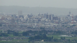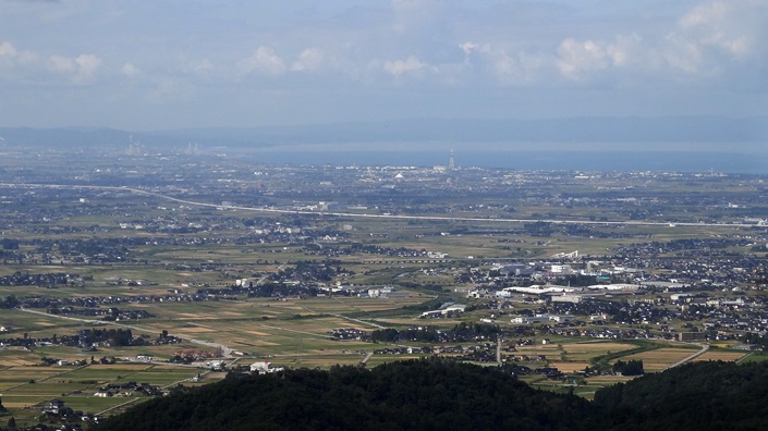 ![]() 木の生えていない、細長い頂上で展望が良い。お目当ての剣岳は、雲の上から、ちょこっと頭を出している。 ![]() ハゲ山方面。一番手前の稜線の上に、ちょっと頭を出しているのがハゲ山らしい。 ![]() 海の方面は、遮るものが無い。 ![]() 同じ道を戻って、15.30分に車に着いた。頂上には誰も居なかったが、途中で3人ほど登ってきた。駐車場では、浅生の方から登山者二人がやってきた。城ヶ平山を越えて降りて来たものだろう。 帰りに、大岩さん入口の「大岩不動の湯」という、日帰りのお湯に入って帰る。 2012年09月16日(日)3回 水上集落より「ハゲ山」と「峠山」往復 昨日は、富山県の塔倉山と吉峰山を歩いた。今日は、その近くの「ハゲ山」と「千石城山」を歩く予定。富山の山案内本に載っているが、国土地理院地図には「ハゲ山」」は、山名の記入が無い。標高の記入も無い。登山路の記入も無い。地図とにらめっこをして、ようやく、それらしきピークを見つけ出す。たぶん間違いないだろう。間違えていて、登山口が見付からないと大変だぞー。 7.30分に、徳光SAで二人を拾う。相棒K君は「ハゲ山」は未踏。H女史はコンロを買ったので、美味いコーヒーを入れてくれるという。期待しよう。今日は三人だ。 立山ICで降り、上市町の役場前を通り、山に向かう。そのまま県道154号線になり、上市川ダムを過ぎると「西種」という村に突き当たる。ここから右に「水上」と云う村に向かう。標識も無いので、適当に林道みたいな道に入り込んだら、神社が見えてきて、上手い具合に水上の村に出たらしい。 ![]() ゆっくりと村の中を走ったら、民家の間に登山路の標識を見付けた。村の中は道路が狭いので、村はずれまで出て空き地に車を止めた。8.55分。 ![]() 民家の間の標識は、なかなかユニークで、味があってよい。ピークが三つあるようだ。この道を入った所に、駐車場があるが、登山者用か民家用か判らない。 ![]() 9.00時に歩き出す。あぜ道を歩く。分岐には小さな標識がある。杉林を抜け、林道を横切る。 ![]() 9.15分頃、尾根の上の鞍部に着く。右の瘤から登山路が下りて来ている。県道から直接、ここに登ってくる道が有るようだ。分岐を左に登ったら、10.23分、「中部北陸自然歩道」の標識のある分岐に出た。右がハゲ山、左が城ケ平山となっている。「城ケ平山」は大岩日石寺から登る道があるようで、城ケ平山からここまで縦走路があるようだ。この標識のある右側が「袖山」らしいが、遊歩道は頂上を通らなくて、西側を捲いている。上にアンテナのようなものが建っているようだ。 袖山を過ぎ、ハゲ山の西側を捲いて、突き当りを戻るように頂上を目指す。9.40分ハゲ山頂上到着。まず目に付くのは「剣岳」。 ![]() 下に、登ってきた方面の、西種の方面の棚田が見える。剣岳の右の高い山は、大日岳だろう。その手前は、これから登る「千石城山」と思われる。 ![]() 海側の展望も良い。高速道路が走っている。 ![]() ![]() 魚津水族館そばの「大観覧車」が見えた。 ![]() 頂上で記念撮影。今日の3人。海の方の先に、ここから続いている、低いピークが見える。あれが「西山」だと思うが、登山路が伸びていないようだ。 ![]() 四方を眺めながら、相棒の抹茶冷茶を頂く。棚田がいいね。 ![]() 下山途中、西種へ降りる分岐にリュックを置いて、城ケ平山の方に見えるピークを往復する。地図を見るとこのピークに、477mの記入がある。ハゲ山より高い。この辺りで一番高い。 ![]() 地図には、山名の記入は無いが、登ってみたら「峠山」の標識が建っていた。後ろに見えるのが「城ケ平山」と思われる。ここからも剣岳が良く見える。 ハゲ山は、40分で登れた山だが、なかなか良い山だった。 続きは下の稿「千石城山」に続く。 2012年09月16日(日)3回 ふるさと剣親自然公園より「千石城山」往復 ハゲ山から降りて、すぐ千石城山に向かう。この山は、地理院地図に「城山(千石城山)」の記入があり、三角点もあり、登山路の記入もある。近くに「城山(稲村城山)」と云う別の低い山もある。相棒K君より、剣岳展望の山だと聞いている。しかし彼が登ったのは積雪期で、カンジキ登山で、夏山登山路とは全然別の道のようだ。そんな訳で二度目の山だが、彼は同行してくれた。 ![]() 水上の村から東種の村に向かい、「ふるさと剱親自然公園」に向かう。「上市川第二ダム」のロックフィルダム堰堤の上が道路になっている。ダム湖は「早乙女湖」と名前があるようだ。ダムの上の山が「千石城山」らしい。11.00時。ダム堤の上を渡り、湖畔沿いに少し行くと「カヌー競技場」がある。 ![]() さらに進み、その先で左に、丘を登って行く。レクレーション施設が色々あるようだ。キャンプ場は連休で賑わっている。409mの記入地点から右に登って行くと、突き当りに広い駐車場があり、展望櫓が見える。左に折れて少し行くと、左側に「展望台」の矢印標識があり、道が広くなっているので車を置く。11.20分。 ![]() この道は、