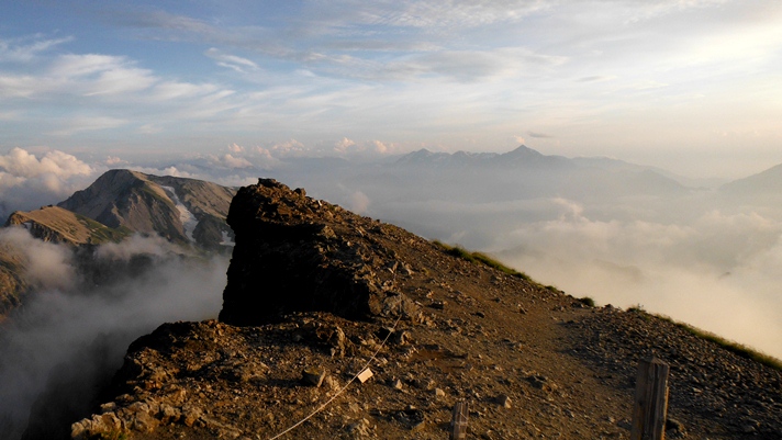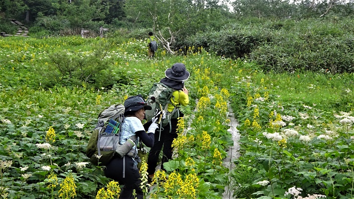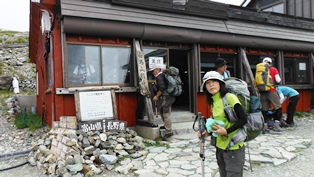 ![]() 記念撮影をして、 ![]() 頂上から少し離れた所で、昼食。お湯を沸かして入れると、20分で五目御飯が出来上がるという優れもの。美味しく頂きました。向こうに剣岳か見える。 仲間のN氏が、同じ頃に、この剣岳に登る事を聞いていた。ひょっとすると今頃登っているかなー、と話をした。(帰ってから聞いたら、一日後にずれていて、霧雨だったらしい。残念) ![]() 頂上から先へ少し降りると、白馬山荘が下に見えてくる。旭岳の雪渓に人が見える。この山を捲いて、祖母谷温泉へ降りる道がある。 ![]() ![]() 12.30分、「白馬山荘」に到着。800人収容の日本最大の山小屋らしい。受付の前に富山県と長野県の境界線標識がある。富山県側の別館三階の小部屋に入れられた。今日は超満員ではないらしい。 ![]() 長野県側に「スカイプラザ白馬」と云う展望レストランがある。生ビールのジョッキを飲んでいる人が多い。あまり美味そうなので、真似をして小さい缶ビールを飲んだら、てきめんに酔っぱらった。部屋に戻って寝込む。 17.00時に夕食。落日が望めるかもしれないと、靴を履いて付近を散策。お天気が良いので、そのまま頂上まで、もう一度登る事に。 ![]() あんまり人は居ない。頂上の「方位盤」は、新田次郎の小説「強力伝」に書かれた方位盤との事。強力が一人で担ぎ上げたらしい。 ![]() 真下に「白馬大雪渓」が見下ろせる。雪渓の真ん中に登山路の黒い線が見える。明日はあの雪渓を降りる。 ![]() 南の方は、今日越えてきた「小蓮華山」。小ではなくて、堂々と大きい。 ![]() 「剱・立山」が、また見えてきた。日本海に落ちる夕日は見えなかった。雲があった。 ![]() 「白馬鑓ヶ岳」と、手前の頂上がまっすぐの「白馬杓子岳」 ![]() 小屋へ戻る少し手前で「雷鳥」を見かけた。 「白馬大池ー白馬岳頂上」の稜線で見掛けた花。名前は間違っているかも。 ![]() ![]() ![]() リンネソウ ミヤマシャジン ミヤマコゴメグサ ![]() ![]() ![]() タカネナデシコ シナノキンバイ ミヤマアズマギク ![]() ![]() ![]() タカネヤハズハハコ イワギキョウ イブキジャコウソウ ![]() ![]() ![]() コウメバチソウ オンタデ ミヤマリンドウ ![]() ![]() ![]() トウヤクリンドウ コマクサ ウサギギク ![]() ![]() ![]() ハクサンフウロ ミヤマツメクサ ミヤマシオガマ ![]() ![]() ![]() ミヤマダイモンジソウ イワヒバリ ハクサンイチゲ ![]() ![]() ![]() クロトウヒレン クモマミミナグサ ウルップソウ 第3日 8月13日 ![]() 昨日が天気が良かったので、今日も晴れると思っていたのに、濃い霧で小雨。6.00小屋出発で、下山に掛かる。頂上小屋を過ぎると、急な沢沿いの降りとなる。お花畑が続く。 7.30分.避難小屋通過。8.00時、葱平の標識通過。 「頂上小屋」より「大雪渓」の間で見掛けた花。名前間違えているかも。 ![]() ![]() ![]() イワオウギ ハクサンフウロ ウルップソウ ![]() ![]() ![]() ホソバトリカブト オタカラコウ テガタチドリ ![]() ![]() ![]() シロウマアサツキ ミソガワソウ オオハナウド ![]() 8.45分、ようやく大雪渓の取り付きに到着。濃い霧で残念。家から持ってきた、小さな爪を靴に着ける。里山での、山の斜面用だ。なんとかこれで大丈夫みたいだ。 周りが見えないので、只、もくもくと降りるのみ。だいぶ下まで降りてきたら、一瞬霧が晴れて、下の方が見えた。お天気が悪いのに、ぞろぞろと登ってくる。 ![]() 10.10分、ようやく大雪渓を通過、右側の台地に取り付く。これから登って行くパーティ。 ![]() ![]() 10.40分。白馬尻小屋に到着。売店とトイレと小屋がある。前の広場にベンチがあるので、昼食にする。またパラパラと小雨。 広場から大雪渓の取り付き部分が見える。雪渓に歩き出す人影が見える。 ![]() ![]() 広場の横は、大雪渓から流れ出す水で、轟々と流れている。大雪渓はまた霧に包まれた。 30分程休んで、ここからしばらく降りると、未舗装林道に出る。ホトトギスなど咲いている道を行く、バスの終点地点の「猿倉」は、少し手前で林道より離れて、近道を行く。下に、バスが停まっているのが見えた。ひょっとすると間に合うかもしれない。先に行ってバスに待つよう、S女史に頼む。 ![]() 猿倉発、12.20分のバスに、2.3分前に到着。ギリギリ間に合った。白馬駅12.50分到着。駅前よりタクシーで車を置いた栂池高原へ。3000円。 ![]() 駐車場の隣の「栂の湯」に入る。源泉かけ流しで少し熱い。誰も居なかったので、水を入れて入る。駐車場を出るとき、追加1日分の300円を払う。思ったより早く帰れそう。 悪天を予想していたのに、思ったより天候に恵まれた。高山植物も多く撮れたので満足している。 |