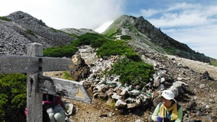 小蓮華山頂上で、大休憩の予定だったが、入れないので、頂上を回り込んだ先の、登山路の広い所に陣取って、コーヒーを沸かしてもらう。富山平野が見えそうな感じ。 ![]() 「サロンパス雪渓」が近ずいてきた。あの横辺りが「三国境」地点らしい。 ![]() ![]() 9.50分、「三国境」地点に到着。右に「雪倉岳」への縦走路が分れている。富山県と長野県と新潟県の、三国の境界線になっているようだ。 いよいよ白馬岳への登りに掛かる。頂上の西の「旭岳」が見えてきた。 ![]() ![]() 11.15分。ようやく白馬岳の頂上到着。東側が垂直に切れ落ちている。怖い。少し雲が出てきた。大きな三角点が在る。 ![]()