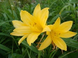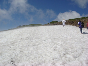 2007年07月25日(水)初登山 K君と三山登頂のB月山 今日は相棒K君と、東北三日目で三山目、「月山」に登る。早朝5.00、「休暇村・羽黒」の部屋の窓から、これから登る月山が見える。今日も快晴である。この山に登りたかったのは、奥の細道の旅で、芭蕉が登っているからである。時々芭蕉の歩いた跡を尋ねている身としては、山好きの身としては、ここを逃すわけにはいかない。 5.30分、フロントでお弁当を受け取り出発。宿のすぐそばから登山道路が延びている。芭蕉はこの近くの宿坊から歩き出しているが、我々は舗装してある道路を八合目まで登る。6.10分終点駐車場に到着。 広い駐車場の向うに庄内平野が俯瞰できる。風があって寒い。車の中で朝食の弁当を食べて、出発の準備をして6.50分に歩き出す。 歩き始めから草原状で気持ちが良い。お花畑の中を歩いているみたいだ。前方に頂上らしきものが見える。 7.05分、中ノ宮の「御田ヶ原参篭所」に着く。白装束の神主さんがいる。鳥居をくぐって弥陀ヶ原湿原に入ってゆく。 ![]() 白山や立山の弥陀ヶ原みたいな感じである。大きな池塘がある。散策路が分かれている。 一段登って振り返ると、参篭所の小屋が見える。点在する池塘は「いろは四十八沼」と言うらしい。ずーっと遠くに、かすかに鳥海山が見える。 ![]() ニッコウキスゲが咲いている。向うに見える小山を越えてゆく。一ノ岳と言うらしい。 ![]() 初めての雪渓を横切る。さすが東北の山である。2000mに満たないのに、雪が残っている。 8.50分、仏生池小屋に到着。飲み物を売っている。小屋の前に小さな池があり、周りにハクサンフウロの群落がある。石仏が多数置いてあり、賽銭箱が置いてある。ここら辺りが中間地点と思われる。 高山植物が多くて嬉しい。私の故郷の山・白山で見かけないのもある。