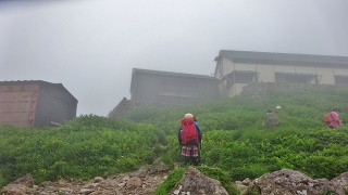 2017年07月29日(土)2回 1日目の羽黒山 7/16日の我が社中「清響会」の発表会も終わり、待望の夏山シーズンが来た。高山植物の咲く白山別山へ登ろうと、24日の南竜山荘を予約してあったが、梅雨は上がらず九州は大雨で被害が出ている。予約を取り消して正解だった。北陸も雨だった。夏山第二弾は、東北の日本百名山の「月山」と「西吾妻山」である。まだ梅雨が上がらない。少々降られるのも仕方がない。何処か簡単に登れる日本百名山に連れて行ってと、N女子とS女子に頼まれて、私が案内するという名目でこの2山になった。 5時、小松を三人で出発。北陸自動車道で新潟へ。新潟より日本海東北自動車道に入る。途中で普通の国道になるが、鶴岡に近づくとまた日本海東北自動車道になる。鶴岡市内を抜けて「羽黒山」を目指す。宿坊が幾つも現れてくると、ナビ頼りで予約してあった宿坊「神林勝金」に無事到着。12.00時。N女子と交代で運転したので楽だった。 ![]() この宿坊は民宿も兼ねているので、ネットで予約出来た。駐車場があったので車を置かせてもらって、これから出羽三山(羽黒山・月山・湯殿山)の「羽黒山」に登る予定。正式参拝道を歩いて登る。石段は2446段あるとの事である。10年前に、初めて月山に登りに来た時、五重塔だけは立ち寄って眺めたことがある。そこから戻って帰ったから、石段も登っていないし、山頂の「出羽三山神社」も参拝していない。ミシュラン・グリーンガイド・ジャポンの三ツ星に認定された道を、今回はぜひとも登る予定。 我々の泊まる宿坊は、「随神門」のすぐ隣である。登山靴を履いて、リュックを被いて、ストックを持って出発。私はさすがにリュックはやめて、肩リュックにペットボトルとヤッケを入れて歩き出す。12.20分、門をくぐり継子坂を一度降り、右手に須賀の滝を眺め祓川を渡る。 ![]() 天然記念物の「爺杉」が左手にある。樹齢推定1000年以上、幹囲8.25mと書いてある。婆杉は明治35年に暴風に倒れたとの事。12.40分。 ![]() その先に「国宝・羽黒山五重塔」がある。12.45分。小雨が降り出したが直ぐに止んだ。 ![]() 五重塔から「一の坂」が始まる。久しく歩いていないのでちょっと辛い。 ![]() 樹齢300〜500年の杉並木が続く。その数400本以上で、国の特別天然記念物に指定。 ![]() 「二の坂」 ![]() ![]() 二の坂を登り切ると「二の坂茶屋」がある。名物力餅。力こんにゃく。色々ある。チョットだけ庄内平野が見える。13.20分。 ![]() かき氷で一休み。ここは中間地点である。 ![]() さらに登ると「芭蕉塚」があった。芭蕉が詠んだ「涼しさや ほの三日月の 羽黒山」に因み、鶴岡の俳人連衆が、江戸中期に建てたという。芭蕉の面影を偲ぶため「三日月塚」と称した。 ![]() 13.45分、さらに登ると右手に「南谷」への分岐の道があった。芭蕉が奥の細道行脚の際、六日間逗留した寺院がこの南谷にあったらしい。今は廃墟となっているらしい。「有難や 雪をかほらす 南谷」と芭蕉は詠んでいる。行ってみたかったが、時間が掛かりそうで諦めた。 「三の坂」を登り切ると突然に頂上広場に登り着く。14.10分。 ![]() 大きな「出羽三山神社」がある。羽黒山・月山・湯殿山の、三神を合わせて祀る神社。茅葺の屋根である。 ![]() 大きな鐘楼もある。 ![]() ![]() 芭蕉さんも建っていらっしゃる。ここから月山まで月山旧参道が続いている。月山八合目迄車道が開通するまで、ここから月山へ登った。芭蕉もここから月山へ登った。 ![]() 出羽三山歴史博物館を訪ね、横のベンチでコーヒーを沸かして昼食とする。この頂上まで登る有料道路があり、バスや自家用車でどんどん人が登ってくる。 15.15分頃下山開始。16.20分頃帰り着く。上り下りで4時間の山歩きだった。 ![]() ![]() 宿坊は入るとすぐ祭壇があり、信者たちが祭礼する。今日も団体の一行が宿泊している。夕食は精進料理。新鮮な地元の食材が並び、とても美味しかった。しかも品数と量も多くまことに満腹した。 明日は「月山」へ日帰り登山。早朝4時に出発予定なので、朝食はお弁当で貰って、支払いを済ませて早く寝る。裏口に靴を回しておく。朝は静かにここから出発予定。 ■次回登山は、明日7/29「月山」へ。下稿の記事に続く■ 2017年07月30日(日)2回 2日目-月山八合目より ![]() 今日は「月山」2度目の登山である。羽黒山の宿坊を早朝4.00に出発。ビジターセンター横から月山八合目への道に入る。途中上から、でかいバスが二台降りてきた。こんなバスでも登れるのだ。もう登山客を送り届けた後のようだ。 ![]() 林道入り口のビジターセンターが一合目で、林道を段々登って、5.05分に突き当りの「月山八合目駐車場」に到着。チョット天気が悪くて残念。もっと車が多いかと思ったが、朝が早いのか思ったほどでもない。 駐車場からは海岸線が見える。鳥海山は雲が掛かっている。5.30分にトイレを済ませて出発。 ![]() 5.45分、月山神社中之宮御田原神社。参篭所であり宿泊出来るらしい。ここから弥陀ヶ原へと出てゆ