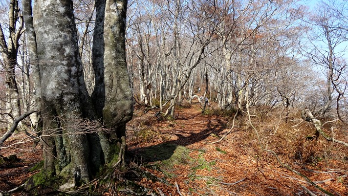 尾根に登り着くとブナの林が続く。残念ながら葉がほとんど散っている。勾配は緩やかになり、若狭の山独特の下草の無い広い尾根を行く。