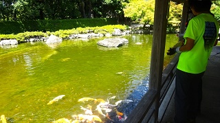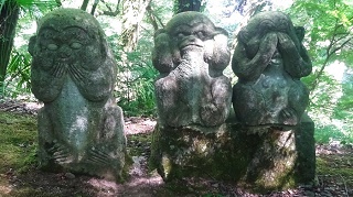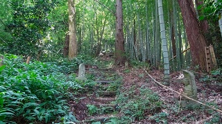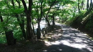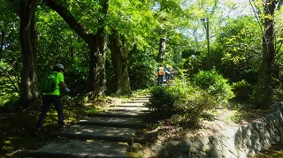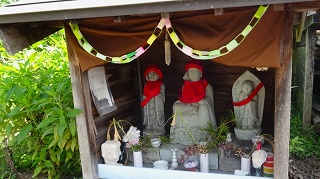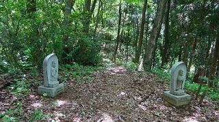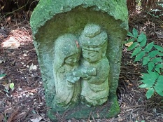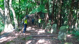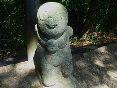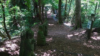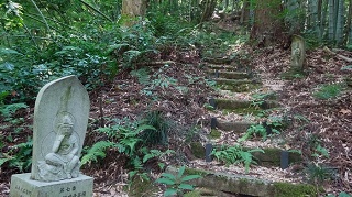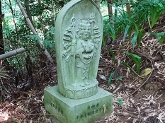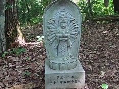 2025年08月30日(土)5回 八幡神社より「長泉寺山」周回 5月に鯖江市小黒町の八幡神社より「三十三間堂」と「祈りの道」で、一人で長泉寺山を歩いた。今日は金沢の二人とS女史を、同じコースで案内する事になった。 西山公園道の駅で金沢組と待ち合わせ。有料駐車場に車を入れる。すぐ前が道の駅である。道の駅の屋上に公園に入るエレベーターが見える。足が遅いので先に車道を歩き出す。一本道なので八幡神社の登り口で待つよ。10時10分。 車道の石仏のお堂。サルスベリ。 また道端の石仏堂。信仰の厚い土地柄だな。 民家のムラサキシキブと赤い花? 民家のノウゼンカズラ。 八幡神社の登り口に到着。まだ追いついてこない。どうしたのか? 説明不足だったかな。 民家の蛙の前で待っていたら携帯が鳴った。道を間違え山に登ったら、レッサーパンダの動物園に着いたという。 動物園まで上がったら、頂上は近いな。皆様はそのまま頂上に登り、頂上で会いましょう。私はこちらから登ります。神社の鳥居をくぐる。10時40分。 二つ目の赤い鳥居をくぐると八幡神社。今日もよろしく。 ここから尾根の上のピーク迄に、33体の観音石像が並ぶ登山道。 神社と案内板。「史跡・三十三間堂」と呼ぶ。 急坂になる。観音石仏は新しいものも、古いのもある。建て替えして居る様だ。 第1番・和歌山県・青岸渡寺 第4番・大坂・槇尾寺 階段の道 階段の道。雰囲気が素敵。 第7番・奈良県・岡寺 一度尾根を横断する。 尾根を横切りピークには登る。三十三間堂参道と書いてある。 第32番・滋賀県・観音正寺 第33番・岐阜県・谷汲寺 ピークの上に到着。これで33観音を完全参拝。御利益がありそうな感じ。よろしくお願いいたします。11時10分。 尾根を降って頂上の方へ縦走開始。 1988(昭和63)年に、市民の心の潤いと安らぎの場を作ろうと、市民グループが「祈りの道設定の会」を作った。千体を目標に設置希望者を募集。石の値段は3万円から4万円で他に設置料。自分で彫っても人に頼んでも良い。自分の記念の為に彫る人が増えて、県外の人も多かった。今は世話する人逹が高齢になり。鯖江市に移管されているらしい。実に色々の像があり見ていて楽しい。今は480体ほどあるらしい。 後ろから登山者が来た。エエーッ?。なんと頂上で会うはずの仲間が、後ろから追いかけてきた。私の事が心配で、動物園からまた下りて、後を追いかけてきたと云う。すまんすまん。獣除けの柵を開けて、車道を登るとすぐ頂上である。 頂上手前の道路の真ん中に三角点マーク。この中に「3等三角点・点名は御館・標高は111m」ここが長泉寺山の頂上。 三角点の先に展望台がある。暑くて誰も居ない。 文殊山。 日野山。 スピーカ塔の日陰で昼食。11時40分。暑いが少し風が通る。 祈りの道を下山開始。 ドラえもんを見付けたぞ。 大きなものもある。 祈りの道を通り抜けて、下に降りる。 橋を渡り「嚮陽庭園」の部分に渡る。 鯖江藩7代藩主が、ここに領民の為に憩いの場として、庭園を造った。 それが西山公園の始まりである。シカシカ。いろんな庭。道も色々ある 池に出た。立派なあずま屋がある。 あずま屋で一休み。鯉が集まって来た。 餌の販売機があり与える。取り合い。凄い。 段々と降りて、道を渡って西山公園に戻る。 ツツジの庭園。ゴールデンウイークの混雑を思い出す。 道の駅の屋上に渡る橋。エレベータで店内に降りる。買い物をして、金沢組とお別れ。今日も老人にお付き合い頂き、ありがとうございました。楽しい一日でした。14時。 ■次回登山は、9/3「二堂山」へ■ 2025年05月05日(月)4回 八幡神社より「長泉寺山」周回 ゴールデンウイーク。昨日に引き続き「鯖江・西山公園」を徘徊。 今日は一人。西山公園に入ろうと思ったが何処も車のの渋滞行列。駐車場に入れずウロウロ走って 、だいぶ離れた地点で大きな量販店の、ガラガラの駐車場を見付けて、隅に停めてどうしょうかと地図を見て考えた。西山公園から「長泉寺山」を目指す予定だったが、ヤマップ地図に小黒町の八幡神社からの登り口があるのを見付けた。ここからだと西山公園登り口より近い。ここから長泉寺山に登り、西山公園に降りる事にした。 しばらく車を置かせてください。すみません、帰りに寄ります。長泉寺山に向かって歩き、山裾の車道を左に歩く。11時。 道筋に石仏。 登山標識は無い。通り過ぎて戻る。これが「八幡神社」らしいな。 二つ目の鳥居。左の方に道がある様だ。行ってみる。 「史跡三十三間堂」とかの標識。ここから頂上まで西国三十三ヶ所観音霊場の観音を模した石仏が並び、ここを登る事で「西国三十三ヶ所巡り」が出来るとの事。11.10分。 急坂である。石仏が並ぶ。これは第四番観音像。 第九番観音像。両側に並ぶ。 新しく造り直されたものも。古いものもある。 第九番観音像。中々の急坂。 まだまだ続く。 一度林道と合流。昭和23年頃まで村内の人々が、西国三十三ヶ所ご詠歌を唱えて登り、山頂で昼食を取る
