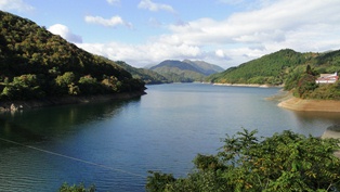6.50分に加賀ゆめのゆで、相棒とS女史を乗せて、福井ICを出て国道158号線を山に向かう。九頭竜ダムに出る。倉谷山は九頭竜湖の向かい側にあるので、橋を渡るために、湖畔を延々と走る。初めて長いつり橋が見えてくる。吊橋の手前で九頭竜湖を撮る。思ったほど紅葉していなくて残念。8.50分。