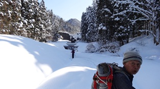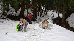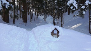 ![]() 海の方は少し木が茂っている。雪のある季節に登った時、この標柱に座った覚えがある。 ![]() 降りは本道の谷沿いコースを降りる。 ![]() この本道は急坂が無い。 ![]() 本道登り口の駐車場が見えてきた。数台置ける。 ![]() 帰りに、岩峅寺の越中一之宮「雄山神社・前立社壇」に参拝する。立山頂上の雄山神社の、麓の社殿らしい。 ■次回登山は、12/9能登「臼ヶ峰」へ■ 2016年03月29日(火)4回 夏椿峠-「頂上」-谷コース 相棒加納君が久しぶりに電話をかけてきた。4月に入ったら一緒に登ろうというもの。話していたら今年に入って2.3回しか登って居無いらしい。流感でも寝込んだらしい。おいおいしっかりしてくれよ。 ![]() その中で「尖山」へ登ったらしい。雪はめちゃくちゃに少なかったらしい。それを聞いたら「尖山」に登りたくなった。今日も晴れ、立山連峰が見えるかもしれないと富山ICで降り、空港の方へ走り、その先から左折県道68号で「大山」を目指す。立山アルペン村を過ぎ、横江の町より林道に入り、町はずれの空き地に車を留める。今日は車検の代車で軽自動車。通行止めの標識が無いので通行できるのかも知れないが、ここから歩く事にする。 ![]() 直進して林道を歩き、標識のある分岐を右に折れ、突き当りの「尖山夏椿峠経由登山口」の標識がある広場に出る。道は整備されていて車でも楽に入ってこれるようだ。今日はこの「夏椿峠経由」で登る予定。 ![]() 入口の標識は地面の近く。気が付かない人もいるだろう。道は案外しっかりとしている。所々の赤いテープも頼りになる。比較的緩やかな道が続く。 ![]() 一度少し下って、さらに登りつめると、夏椿峠に到着する。途中前方に「尖山」の頂上が見える。 ![]() 12.10分に「夏椿峠」の上に到着。峠と云うだけあって先へ降って行く道もある。先へ降る方面は「新村栃津方面」になっていて降り、登って来た方面は「天林横江方面」となっている。前方に「毛勝三山」らしい真っ白の山が見える。 「夏椿峠」なので夏椿の木を探したら、登って行く方面に一本だけ「ナツツバキ」の木がある。右に尾根を登って行くのだが、頂上が近づくとすごい急坂になってくる。尖った山の斜面をまっすぐにロープを頼りに登って行く。結構長い。12.35分に、頂上近くの登山路に合流する。ホッと一息。 ![]() 広い登山路を5分も歩けば「尖山頂上」に到着する。 ![]() ![]() 二組4人が食事中。 ![]() 山名札がまだ残っていた。布ヶ滝という2等三角点がある。 「立山連峰」は、そこそこの展望。 ![]() 「大日岳」「奥大日岳」と「立山三山」。 ![]() 「鍬崎山」と、真っ白の「薬師岳」。 ![]() 真ん中の黒い山は「大辻山」で、右に「剣岳」と「大日岳」。左は「毛勝三山」だろう。 ![]() 「剣岳」。 ![]() 立山より流れてきた常願寺川が、平野に流れ込む。 ![]() 下山は、いつもの谷沿いの道を降りる。林道で花を見掛けた。14.25分に車に到着。 ![]() ![]() ![]() ![]() ![]() ★次項2016年の27回登山は、3/31日「額谷山」へ★ 2015年03月08日(日)3回 谷コース-「頂上」-夏椿峠 今年はまだ相棒K君と一緒に登っていない。わざわざ声を掛けるほどの事の無い、簡単な山ばかりに登っているので、ご無沙汰している。「西山」登山の写真を送って近況を尋ねたら、金沢の仲間と登った記録を送ってきた。「後期高齢者の病人を自覚して、今後は好天に低山級をスローペースで歩くつもり」と書いてある。若い人たちと同行は段々無理になってきたと、私と同じことを言っている。その記録の中に「尖山」の記録があった。それを見て私も「尖山」に登りたくなった。 ![]() 呼びかけたらS女史とN氏が同行してくれる事になった。天気は昼過ぎから晴れる模様。8.50分に徳光SAで落ち合い3人で出発。流杉PAより出て、立山アルペン村の先で、横江町に入り込み村はずれの林道入口に車を停める。上手い具合にここまで入り込めた。この先は除雪してない。9.35分。 ![]() 林道を三度ほど折り返すと尖山への分岐に出る。辺りは一面の雪原となる。踏み跡がしっかりしているのでカンジキは不要である。 ![]() 10.30分に登山ポストのある地点に到着。ここから谷沿いに登って行く。谷沿いの道は長い。水の流れる所は時々地面が見えているが、ほとんど雪の上を歩く。 こんな滝があったかな?。 ![]() ![]() 川を一度渡り、また戻り返す。ほとんど尾根上まで登り、ここで谷とお別れ。 ![]() 左折して山肌を登り出す。 ![]() 左に夏椿峠へ降る分岐を過ぎると頂上は近い。11.35分に到着。天気予報とは違い、一面のガスで真っ白。先着二人は待ちくたびれている。コーヒーを入れて貰って昼食。 こんな冬景色の中で、頂上にある「マンサク」の木が満開である。 ![]() ![]() ![]() 日当たりが良いのかな?。 ![]() 単独の男性が登って来て、尖山は3回目だがいつもこんな天気ばっかり。どうもこの山に嫌われているらしいと嘆く。その彼にシャッターを押してもらう。 ![]() 晴れそうもないのですぐ下山開始。12.10分に分岐より急坂の踏