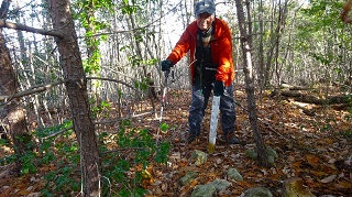 ![]() この写真の先に三角点がある。杖は蜘蛛の巣を払うのに必要品だ。それに藪蚊に閉口する。 ⑥▲「吉森」三等三角点 ![]() 次の三角点⑥番目は、「末寺山」である。今日のパーティの二人は、まだ三角点を見ていないので連れてゆく。 佐野からはすぐ近くだ。いつもの登り口から入り、東屋で藪蚊に悩まされながらコーヒータイム。この時三角点札が無いことに気付き、車まで取りに戻るが無い。 ![]()