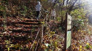 ![]() こども広場の長い滑り台。うーん、やめとこう。 ![]() 駐車場に戻ってきた。10.00時。「能美ふるさとミユージアム」に入館。 ![]() 古墳の出土品が並んでいる。 立山の曼荼羅は見た事があるが「白山曼荼羅」は初めて見た。 ![]() ■次回登山は、11/8敦賀「天筒山」へ■ 2019年12月07日(土)11回 「和田山・末寺山・十名勝」散策 ![]() 寒くなってきた。出るのが億劫だが、連れが居ると有難い。午前中を目標にS女史と能美古墳群の「和田山」と「末寺山」を歩く事になった。和田山に「石川県十名勝」の「白髭神社」があるので、ついでに女史がまだ歩いていない、近くの「石川県十名勝」を案内する事にした。十名勝については前回の散策に詳しく載せた。 ![]() 9.00時に、なかうみの里で合流して能美市佐野町の「狭野神社」に寄る。鳥居横に「石川縣十名勝」の大きい石碑がある。 ![]() 広い境内で、「陶祖神社」もある。佐野生まれで良質の陶土を発見し、佐野窯を創始した斉田道開が祀られている。社叢は能美市の文化財になっており、大きな神木は椎の木らしい。 ![]() 続いて能美市寺井町の「奥野八幡神社」に寄る。背の高い石碑がある。「明公園九谷庄三碑」が石川県十名勝となっているが、この碑の事と思われる。真ん中は「九谷神社」と書いてある。九谷庄三など九谷焼に尽くした人を祀っているらしい。庄三は九谷焼中興の祖と言われ、寺井窯を開いた人らしい。 ![]() ![]() 続いて「和田山」の駐車場に来たら、工事中で締め切ってあり入れない。どうも資料館を新たに建設中らしい。大きな建物が出来上がりつつある。山すそを周って南側の駐車場に車を置く9.55分。 ![]() 登ったら、すぐ霊碑のある広場に登り着く。 ![]() すぐ横から古墳が始まっている。「国指定史跡能美古墳群」。和田山・末寺山・秋常山と他に寺井山・西山の五山を云う、と書いてある。全部で130基以上あるらしい。紅葉しているのはドウダンツツジかな?。 ![]() ![]() ![]() 「和田山」は二つに分断されている。間にキャンプ場がある。一度下に降りてその先の「城山」と云う標識を登る。 道路に降りたら白山が見えた。真っ白になって来たぞ。 登り返したら大きな前方後円墳に出た。「和田山5号墳」である。 ![]() ![]() ![]() ![]() 前方後円墳の終わりに「久常白髭神社」がある。少し長い石段を降りると鳥居があり、「石川縣十名所」の石碑がある。10.40分。 ![]() ここから県道4号線を横断して、向かいの「末寺山」に登り出す。 山に入ってすぐの分岐を右に入る。少し藪っぽくなっている。 「末寺山2号墳」の標識からすぐ後ろの高みに登ると、三角点がある。 ![]()